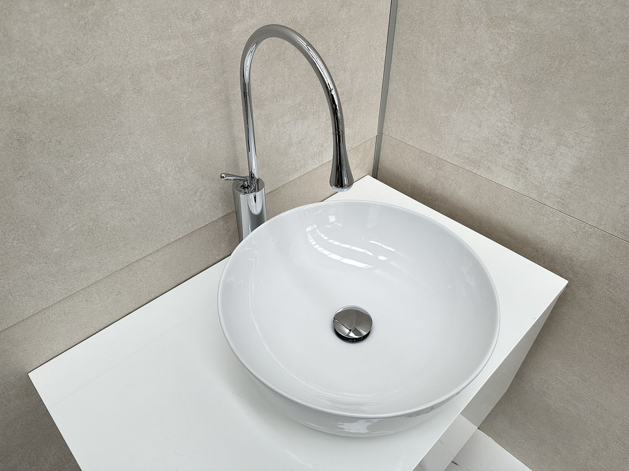 Мивка за баня тип купа. Мивката е предназначена за монтиране върху плот. Един доста сполучлив модел от гледна точка на функционалност, тъй като има голямо удобно за ползване корито.  Комбинира се с батерия за вграждане в стена или със смесител с издължено тяло. Стандартен сифон.