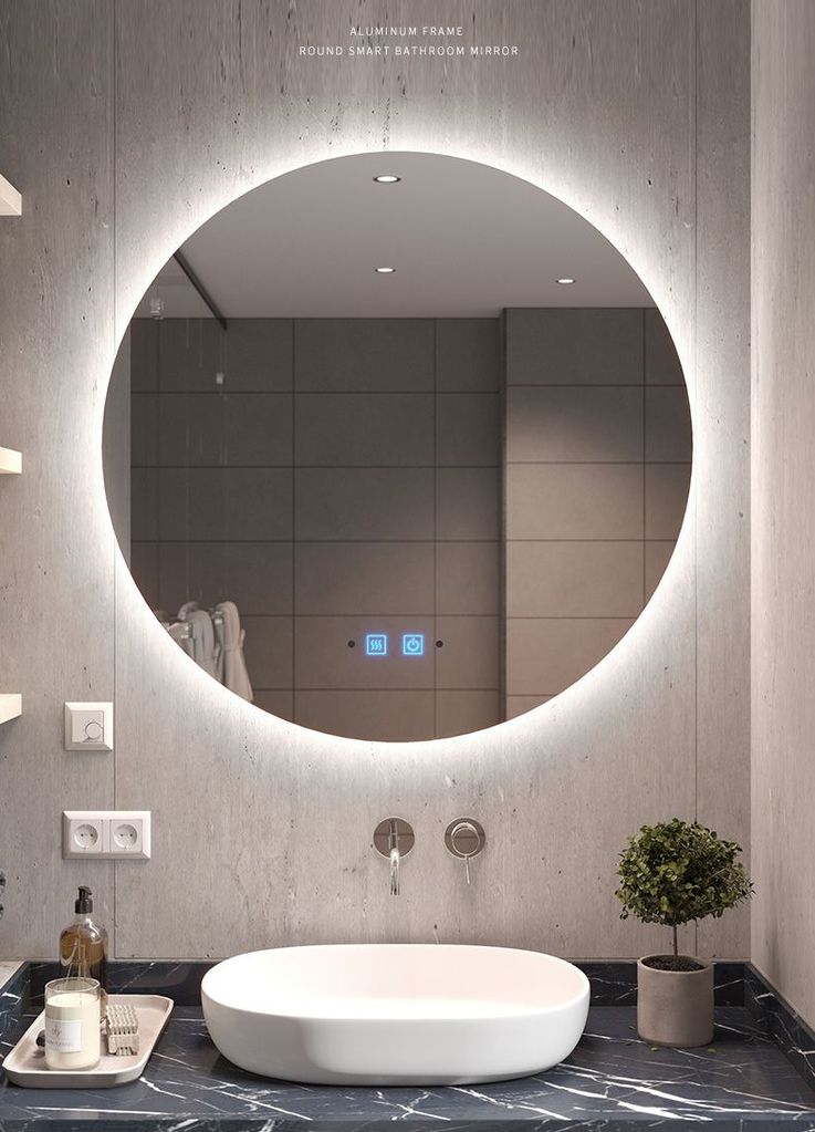 Това е едно наистина страхотно огледало за баня. Снабдено е с LED осветление което е димируемо. Това означава, че може да се избира каква да бъде силата на светлината. Яркостта се наглася посредством задържане на touch бутона.  Бутонът touch реагира на допир. Бутонът за осветлението освен за включване и изключване на светлината служи и за регулиране на яркостта. В комплекта са включени кабел, щепсел и крепежни елементи. Монтажът е елементарен. Целият диаметър на огледалото е покрит странично със светодиоди които осигуряват амбиентно осветление и подчертават по оригинален начин контура на останалите артикули в банята. Поради високото качество на изработка огледалото има кристално отражение.