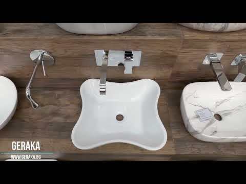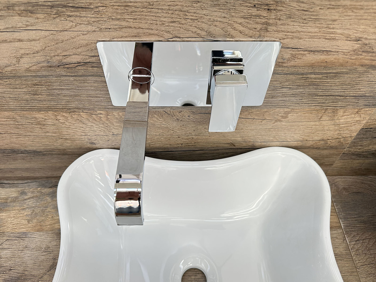 Вграден смесител за мивка в баня. Смесителят е с цяло монолитно тяло за вграждане в стена. Едноръкохватков модел с керамична смесителна глава от високия клас. Специфика при този модел е това, че розетката е цяла и е от типа flat design т.е. плоска и тънка, а не с извивка и удебеление както при повечето варианти от този тип. Това придава много силно внушение за естетичека издържаност и лукс. Дизайнът е елегантен с изразени правоъгълни линии и плоски стени. Покритието е хромирано. Ръкохватката е семпла, плоска, елегантна и метална. Чучурът е достатъчно дълъг и с голям наклон на аератора, за да могат да бъдат обслужвани различен размер мивки. Смесителят е предназначен за комбинация с мивка за монтаж върху плот.