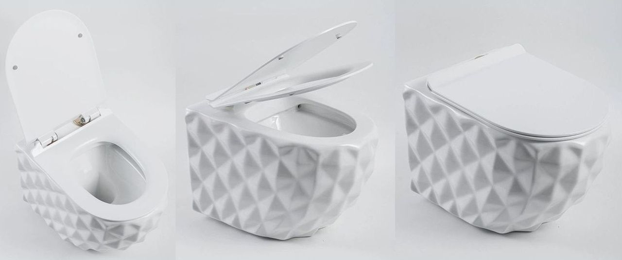 Това е пълен комплект готов за монтаж и експлоатация. Вграденото казанче се състои от воден резервоар; пълнещ и изпразващ механизъм; модул с рамка; крепежни елементи; активиращ бутон с функция 3/6 литра с четири варианта на избор без разлика в цената. Висящата тоалетна е с обливане тип Rimfree и бял гланц. Трябва да се обърне особено внимание на фактът, че чинията е със скрит монтаж, което е рядкост и обикновено на доста висока цена при всеки производител.  Капакът е ултратънък с плавно затваряне и е изработен конкретно за тази тоалетна чиния с цел пълна съвместимост и цялостна завършеност на дизайна.