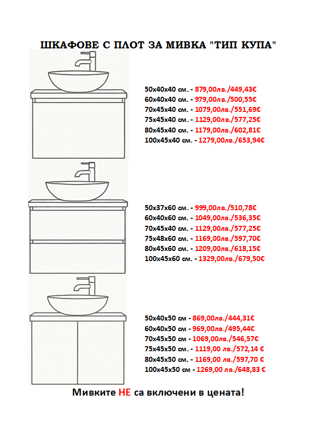 • При моделите с мивка върху плот мивката не е включена в цената.
