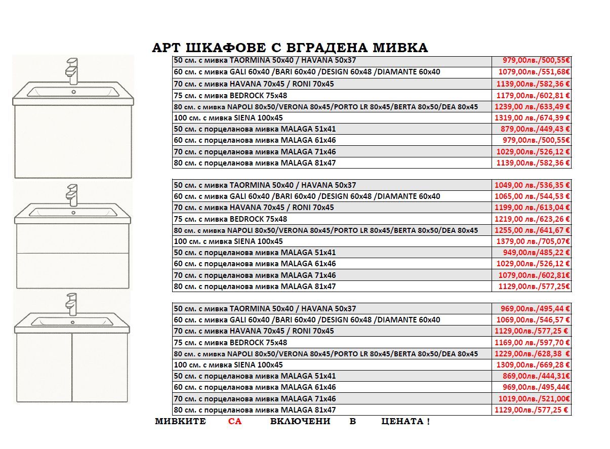 • При моделите с мивка върху плот мивката не е включена в цената.
