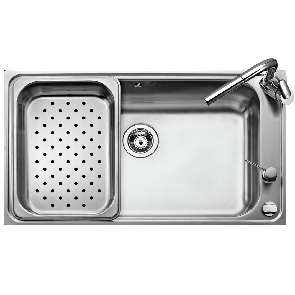 Иноксова кухненска мивка за вграждане в плот. Модела е подходящ за вграждане в шкаф със светъл отвор 900мм. Външният размер на мивката е 860х500мм. Коритото е с размери 736х430мм. и дълбочина 200мм. Модела е с автоматичен клапан на сифона, комлект с мивката има аксесоари-иноксов гевгир, вграден дозатор за течен сапуни и дървена дъска за рязане.