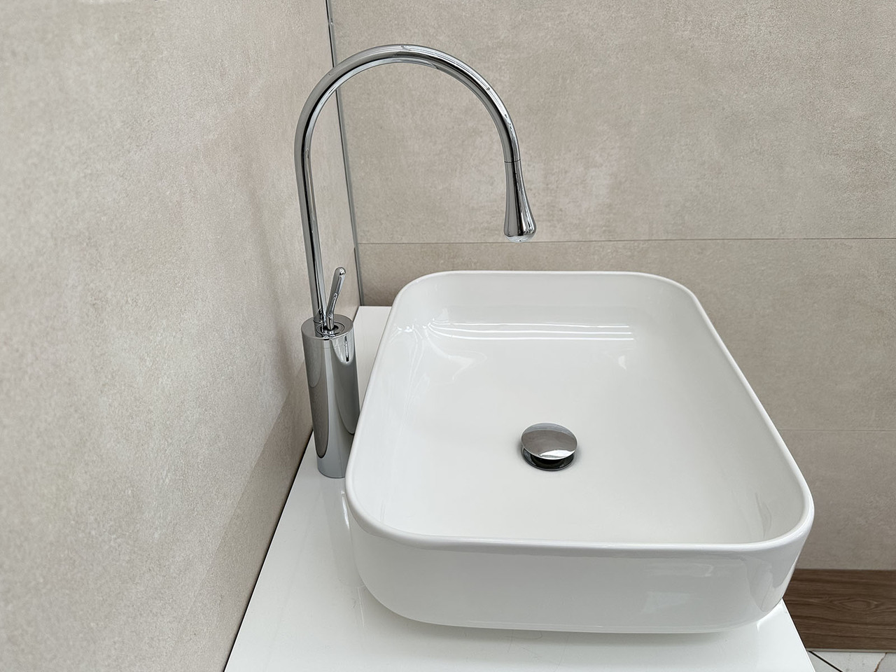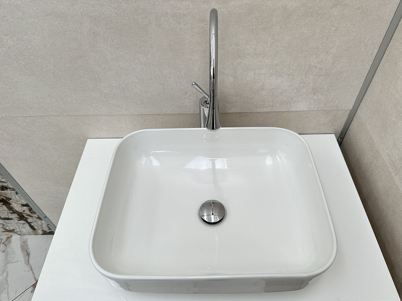 Порцеланова мивка за баня. Моделът заслужава внимание, тъй като е с доста интересен дизайн. Компактна мивка което позволява да се спести пространство в банята, а същевременно коритото е достатъчно функционално и удобно при употреба. Мивката e тип купа. Сифонът е стандартен.Модела е подходящ за поставяне върху плот и се комбинира с висок или вграден смесител