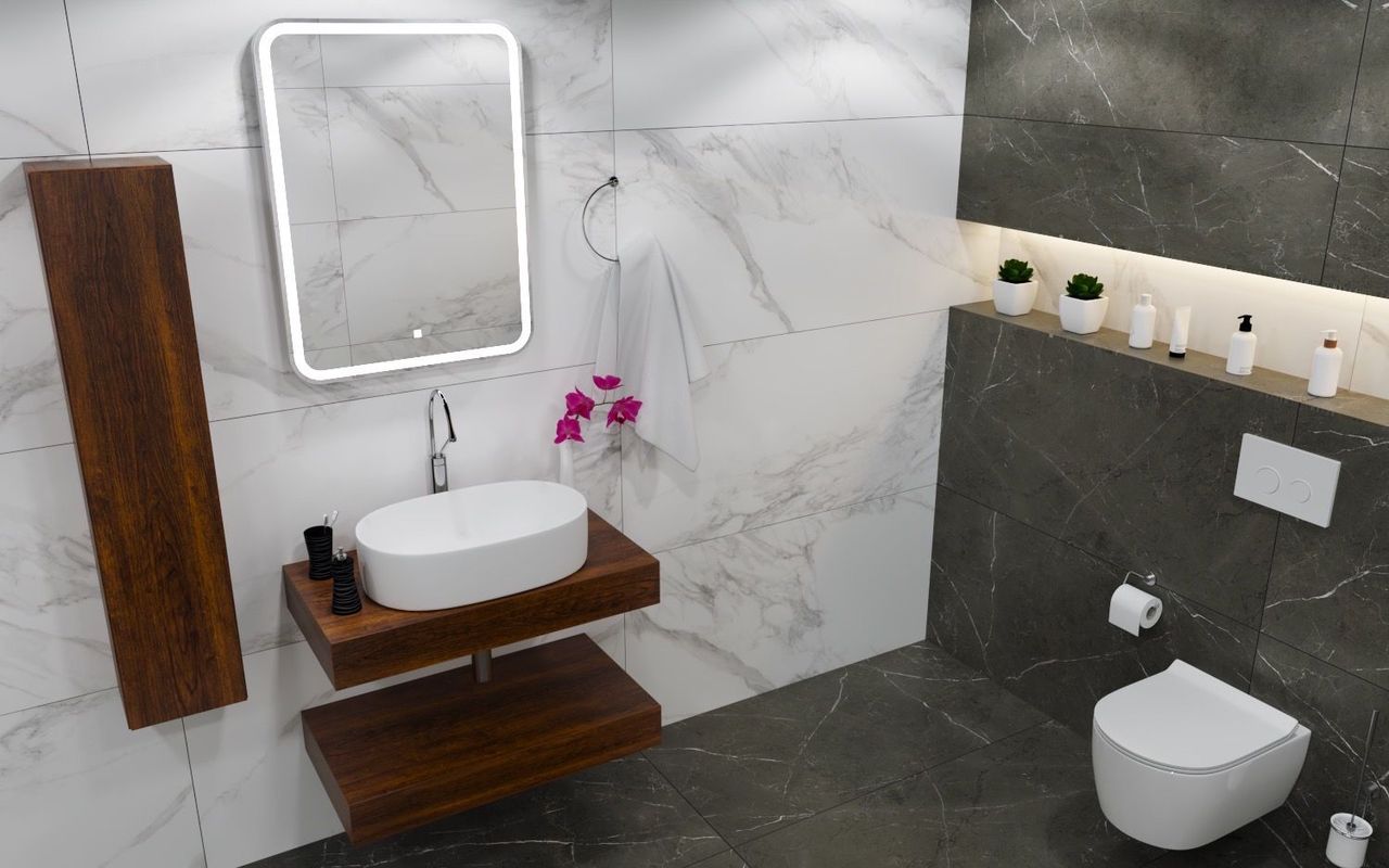 Нашите плотове са налични в различни цветове, включително черен, бял, мраморен, сив, дървесен - дъб и дървесен - череша. Така можете да подберете този, който най-добре се вписва в дизайна на вашата баня. Независимо от избора ви, всеки плот е проектиран със специално внимание към естетиката и лесното съчетаване с различни стилове.