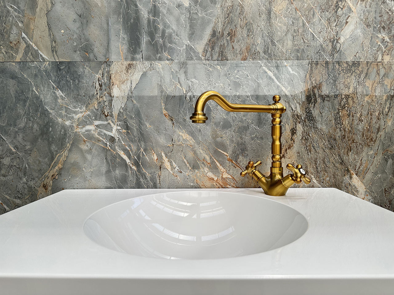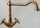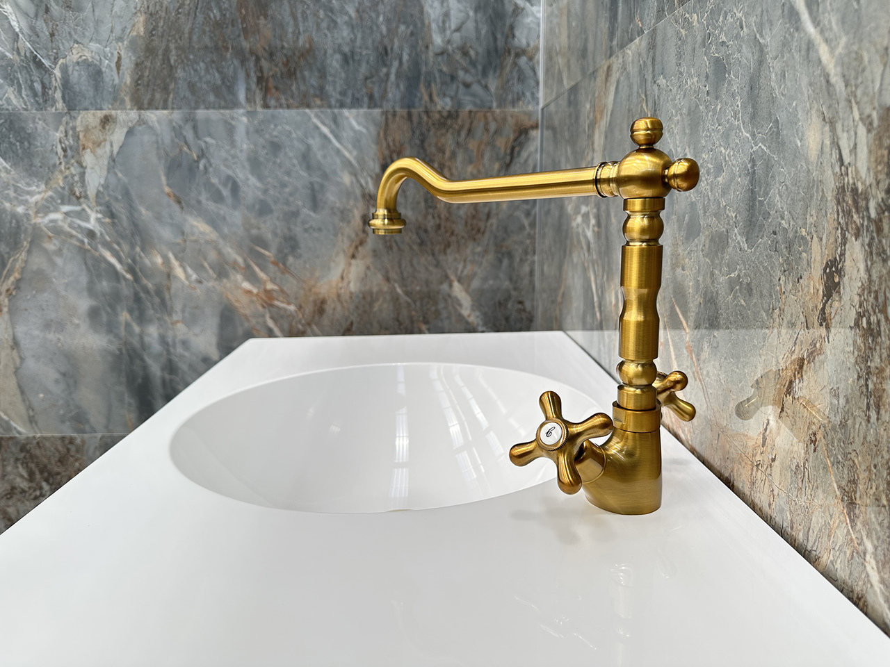 Ретро смесител за мивка с високо тяло. Елегантен ретро дизайн със заоблени форми. Две ръкохватки с керамични затварящи механизми. Покритие в меден цвят. В комплекта са включени крепежните елементи и гъвкави връзки.