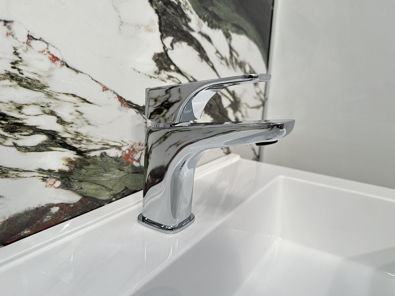 Стоящ смесител за мивка в баня. Смесителят е с много добри габарити и аераторът също като самия чучур има наклон така, че водната струя да влиза навътре в коритото на мивката и да позволява удобната му употреба. Ръкохватката е плътна, плоска и метална. Цялостната му визия е много приятна като се наблюдава успешно съчетание между овални форми и елегантен плосък дизайн. Подходящ е за различни като габарити мивки. Изработен е изцяло от месинг. Смесителната глава е керамична. Покритието на смесителя е в цвят хром. В комплекта са включени крепежните елементи и гъвкавите връзки за топла и студена вода, като не се налага да се закупува нищо допълнително за монтажа или експлоатацията на артикула.