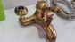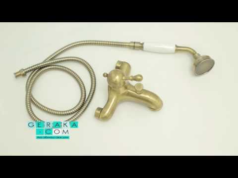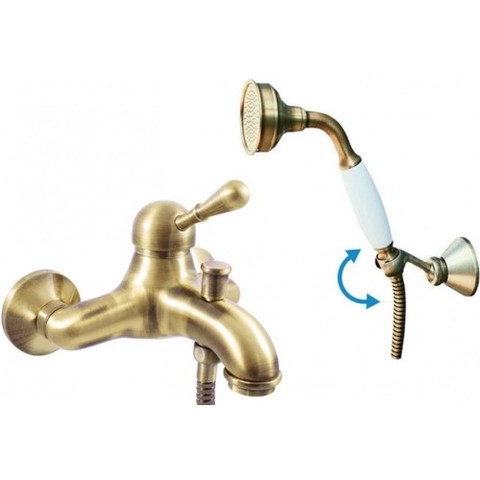 Душ батерия с чучур. Съществен елемент на който трябва да бъде обърнато внимание е това, че покритието на смесителя е изцяло в цвят антично злато/ състарено/, а не лъскаво както при повечето артикули от този вид.Моделът е интересен и с подчертан ретро стил. Има няколко елемента, които създават това излъчване. Ръкохватката е метална, изработена с нестандартна форма с футуристичен дизайн. Обърнато е внимание дори на превключвателя, чиято шапка има интересен ретро елемент. Това дава усещане за завършеност и цялостен поглед върху дизайна. Посредством изтегляне на превключвателя водният поток се прехвърля от чучура към душа. Батерията е изработена изцяло от месинг, както и ръкохватката която също е метална. Смесителната глава е с керамични дискове от високия клас. В комплекта са включени ексцентриците за монтажа и декоративните розетки, които също са метални, ръчен душ-метален с бяла ръкохватка, шлаух и подвижен окачвач.