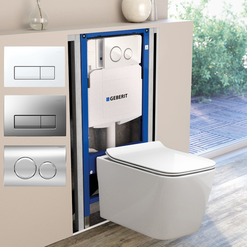 Представяме пълен комплект готов за монтаж и употреба структура за вграждане с тоалетна чиния. Казанчето за вграждане е на Geberit Швейцария с крепежни елементи и красив хромиран активиращ бутон с опция 3/6литра. Висящата тоалетна чиния е с плътен бял порцелан и обливане без ръб. Капакът е сплавно затваряне.