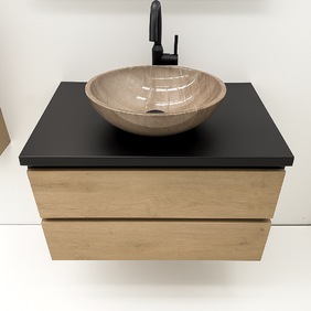 Светло дървесен шкаф с черен плот за баня от ПВЦ с две чекмеджета